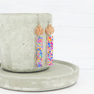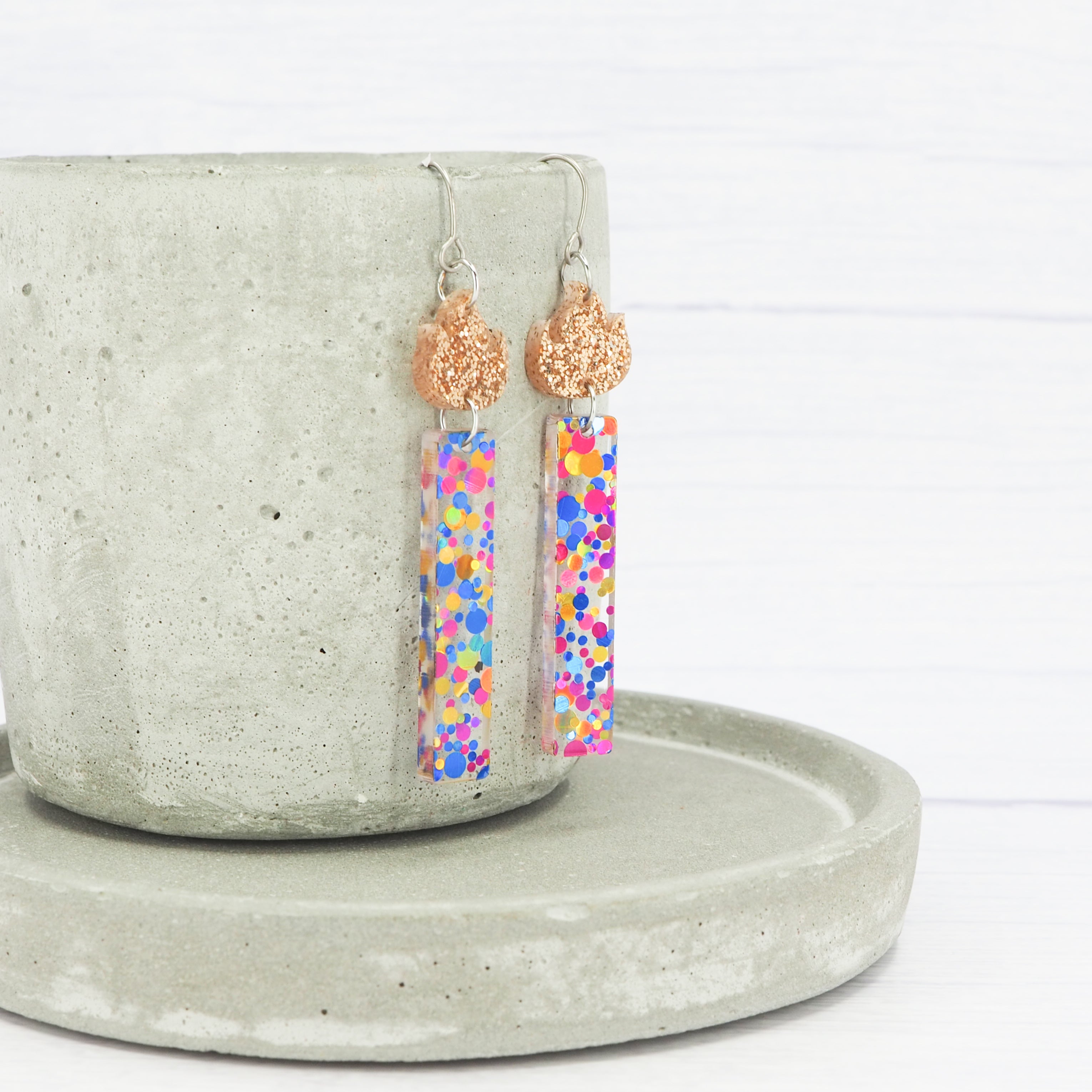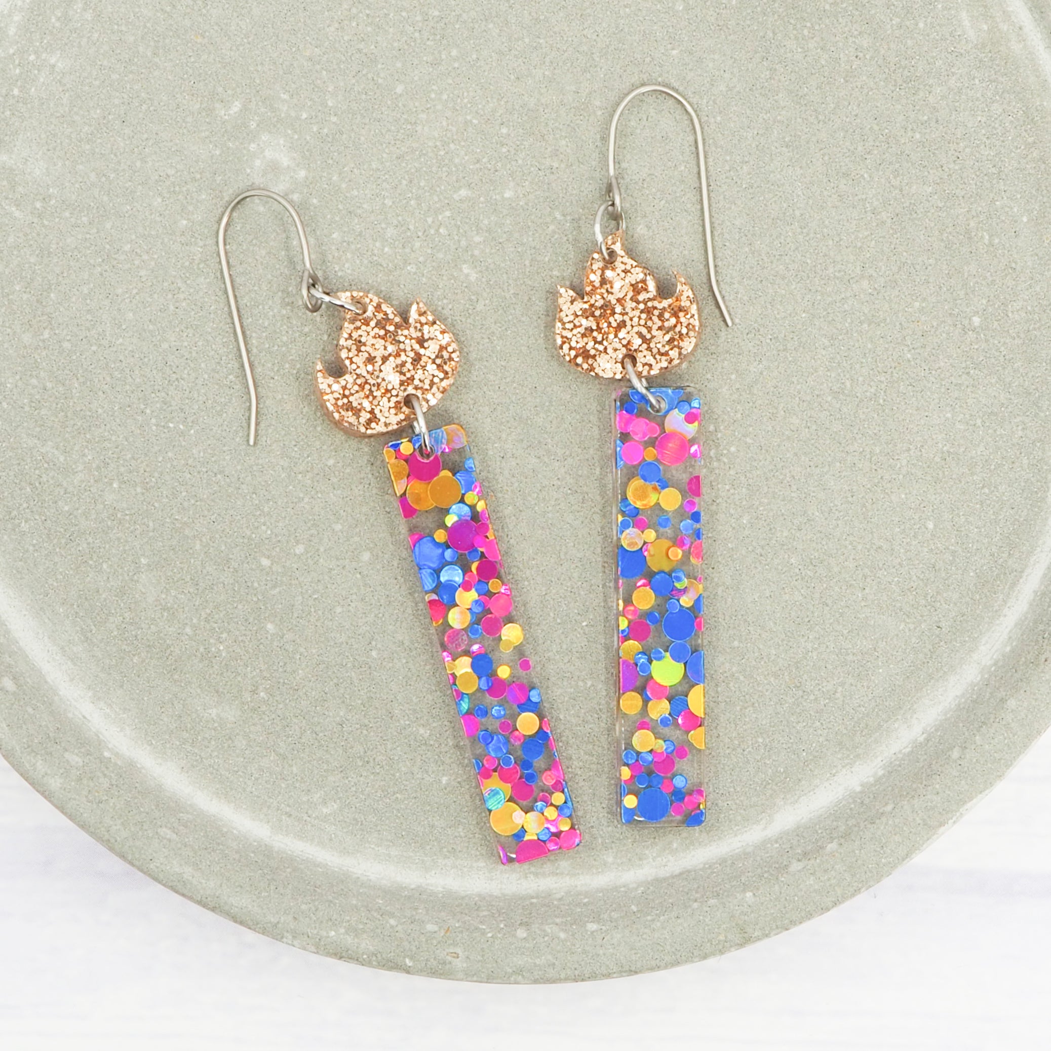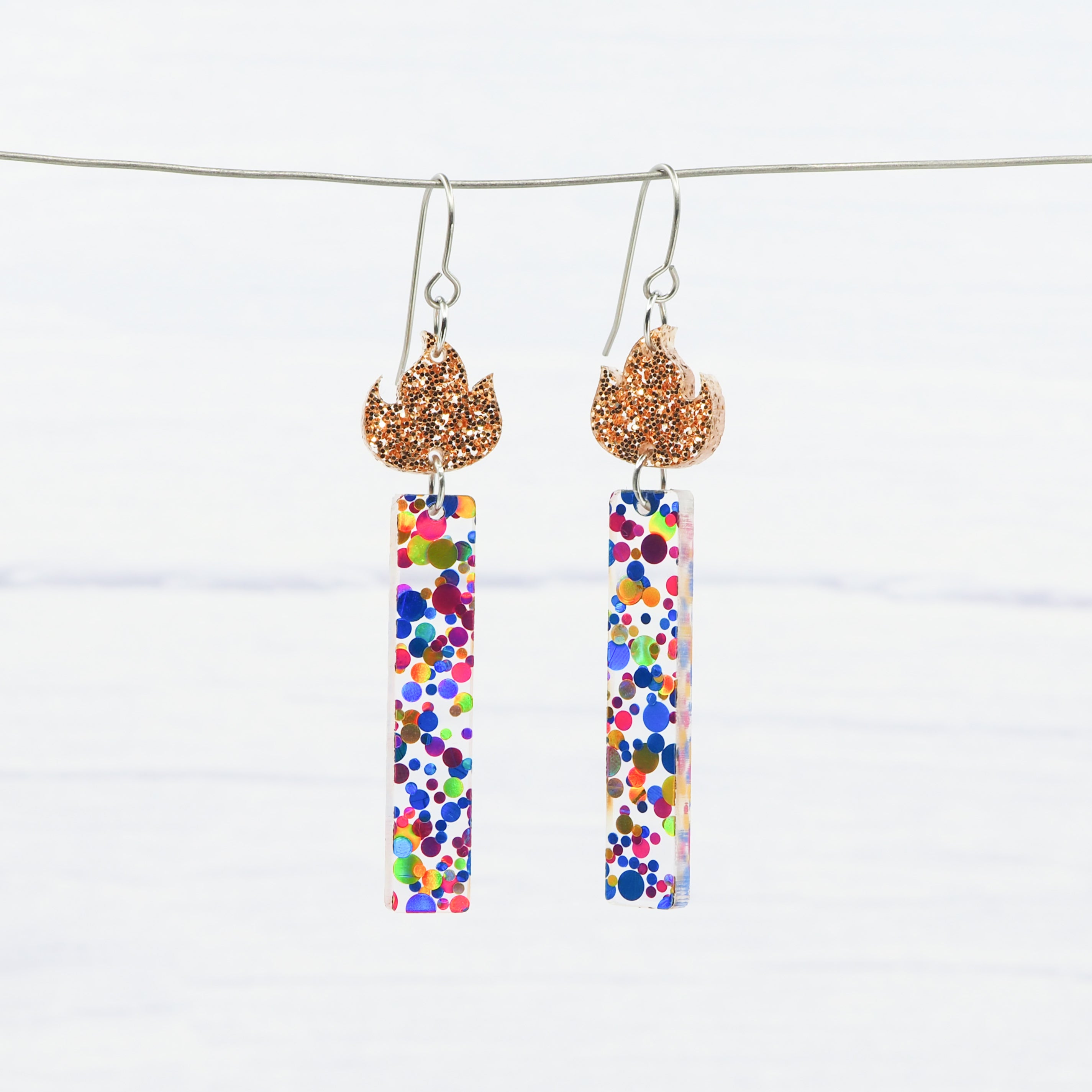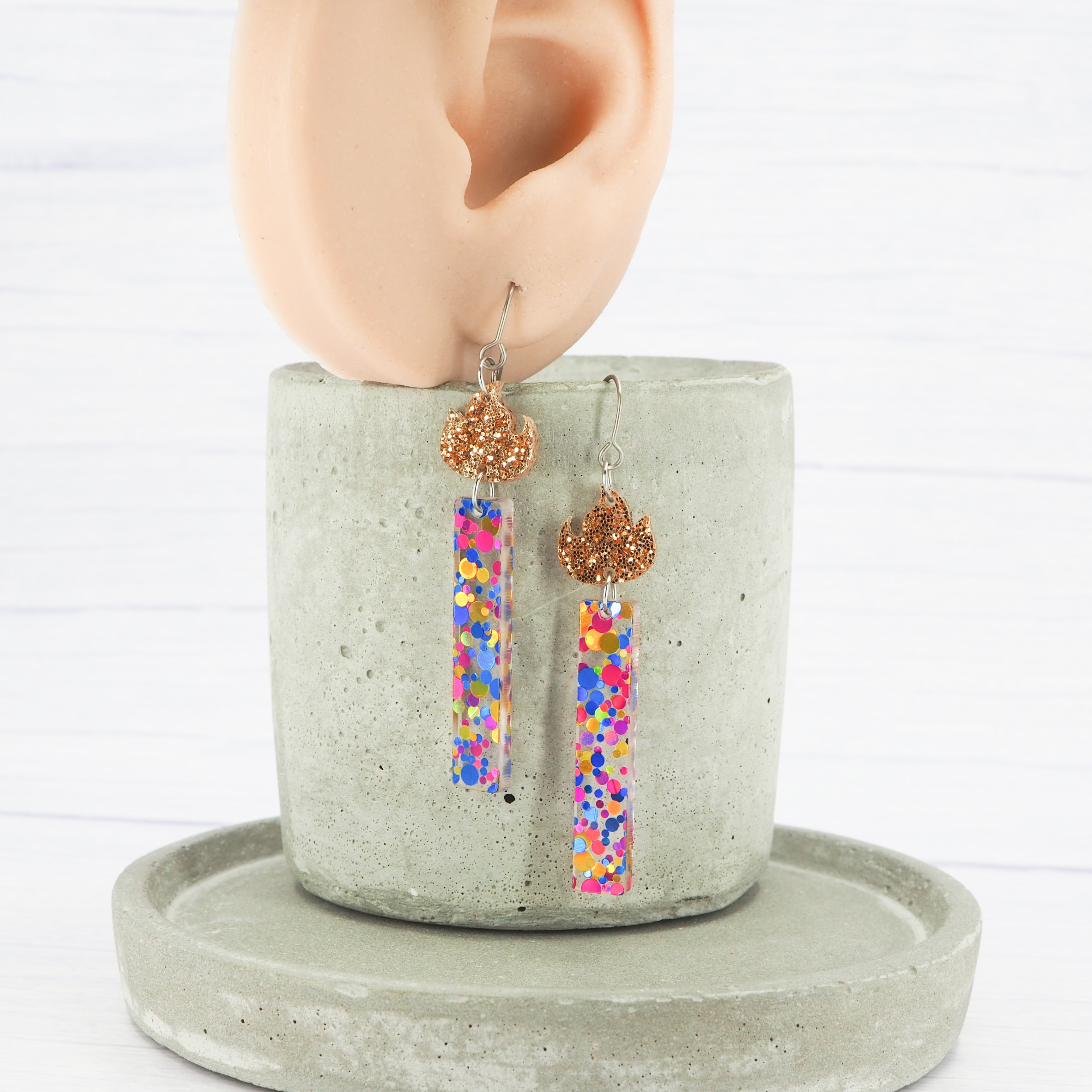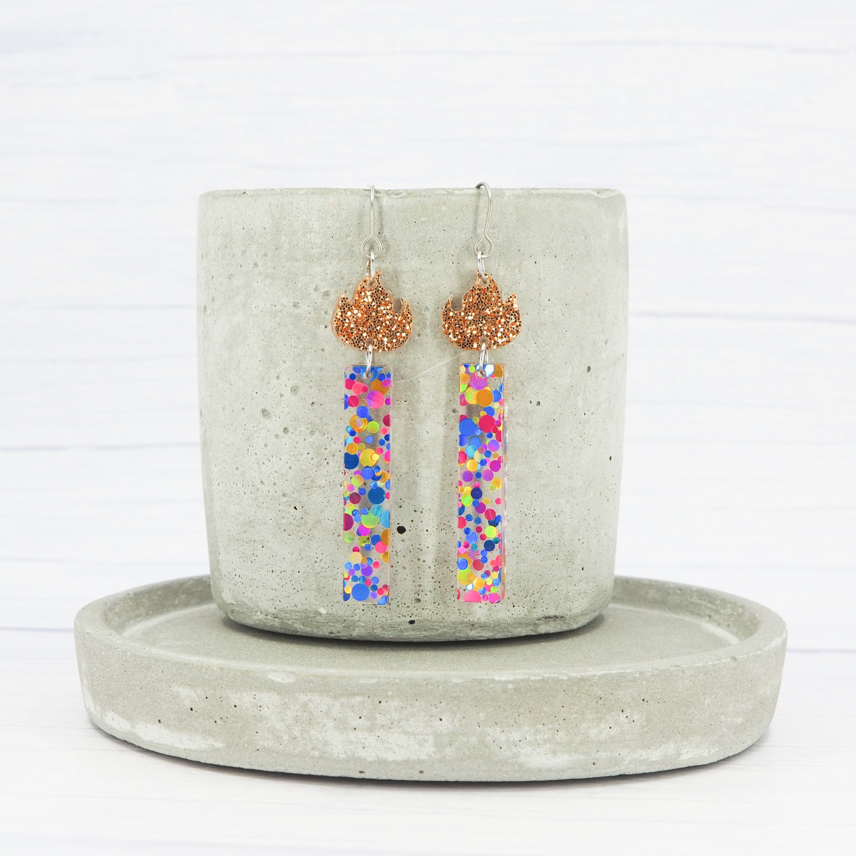 The earrings have a total drop length of 2.8" (7cm) from the top of the ear wire to the bottom of the candle.
