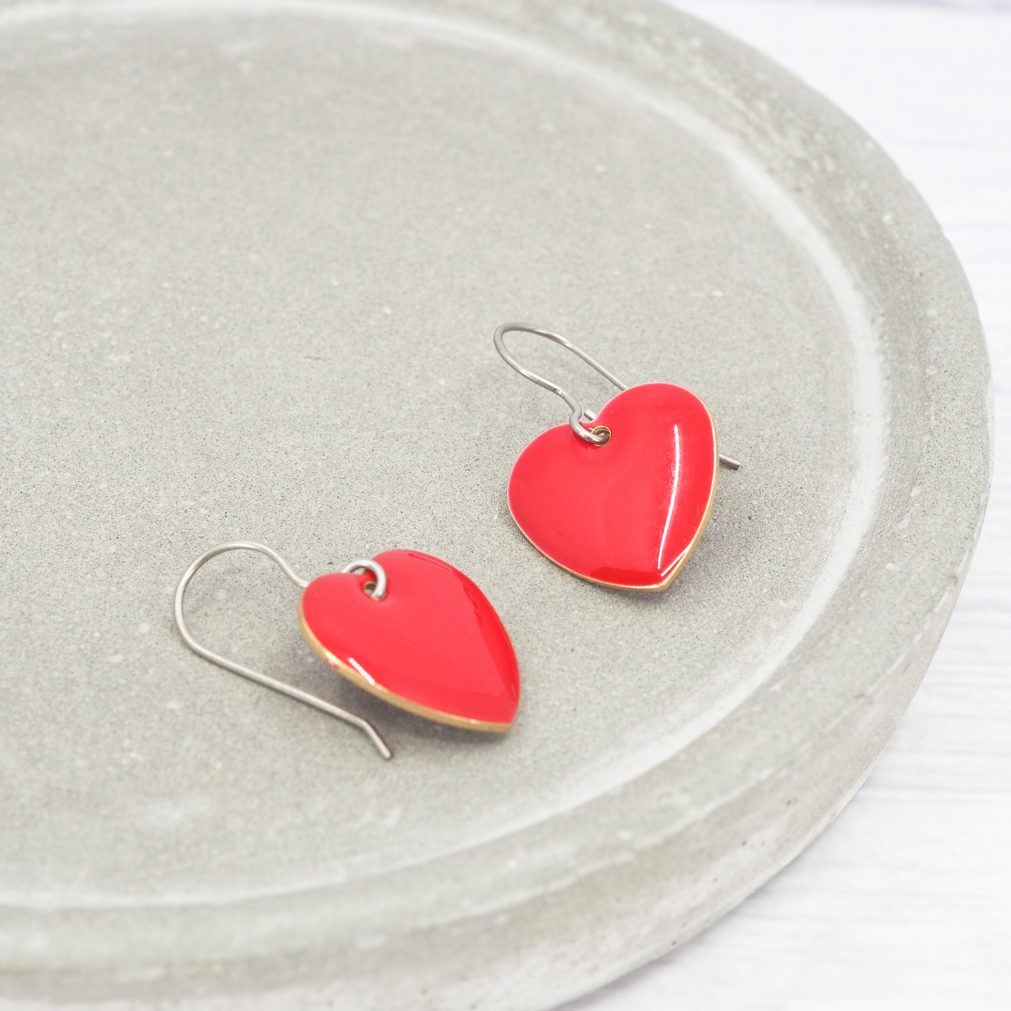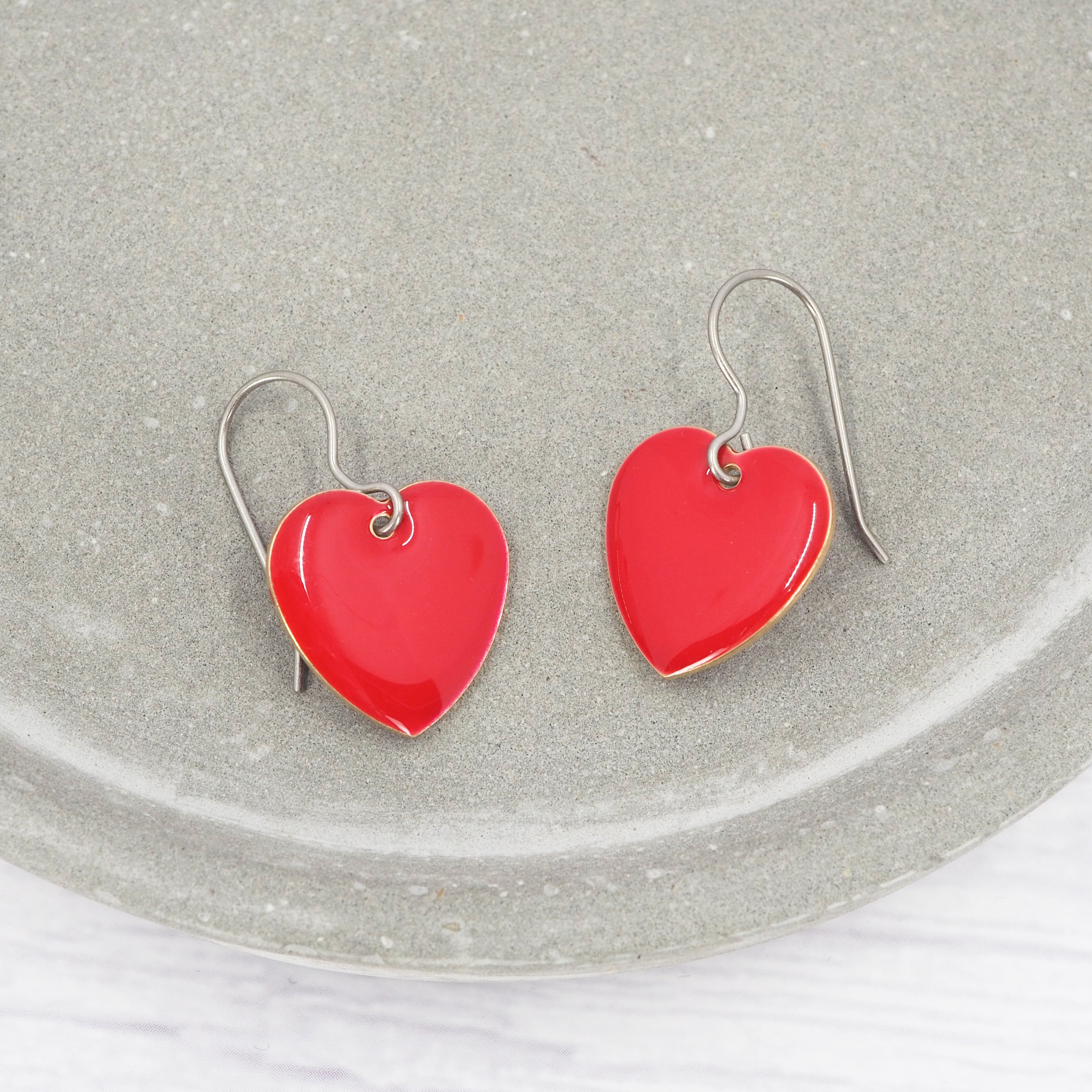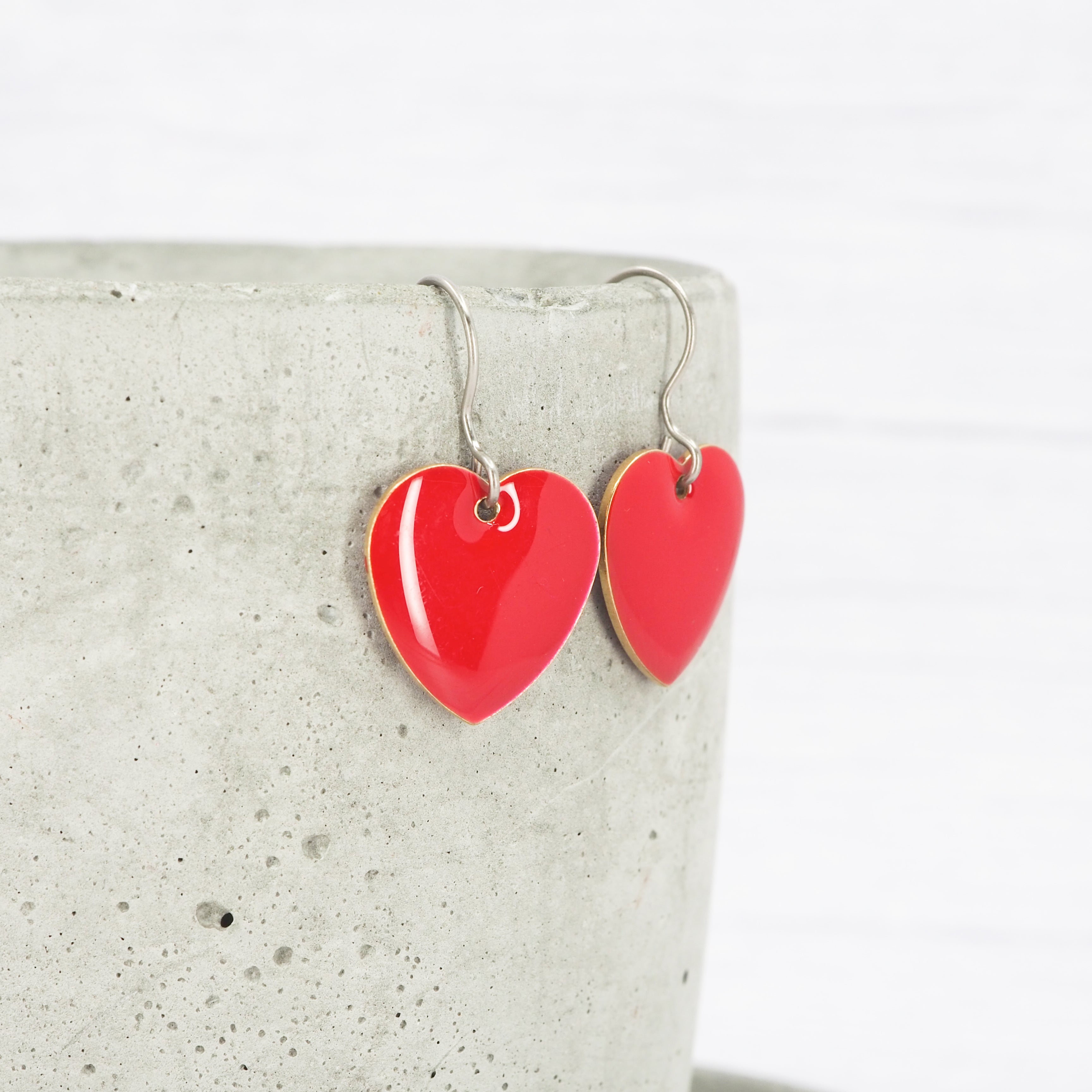 Red enamel heart dangle earrings. Great for all occasions.