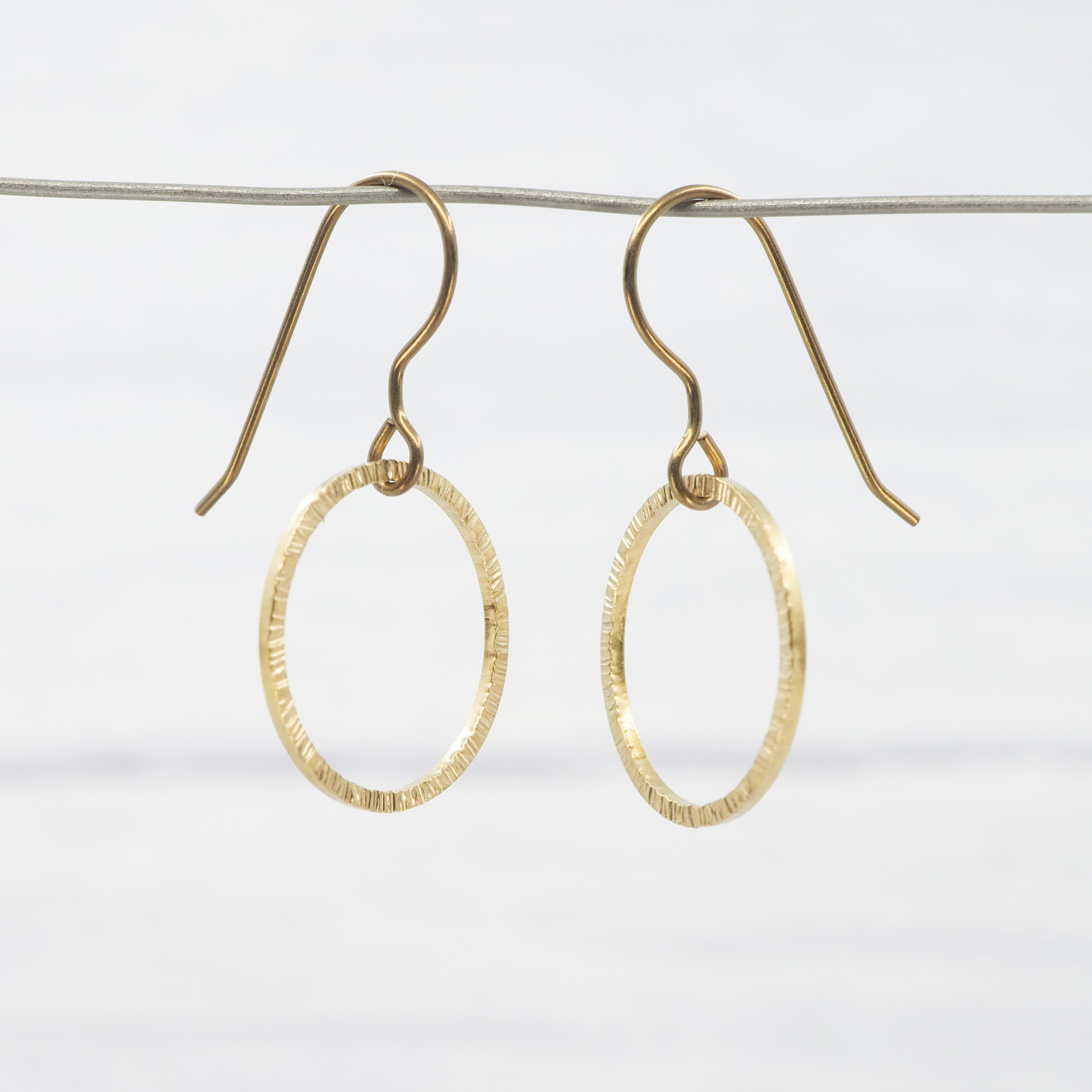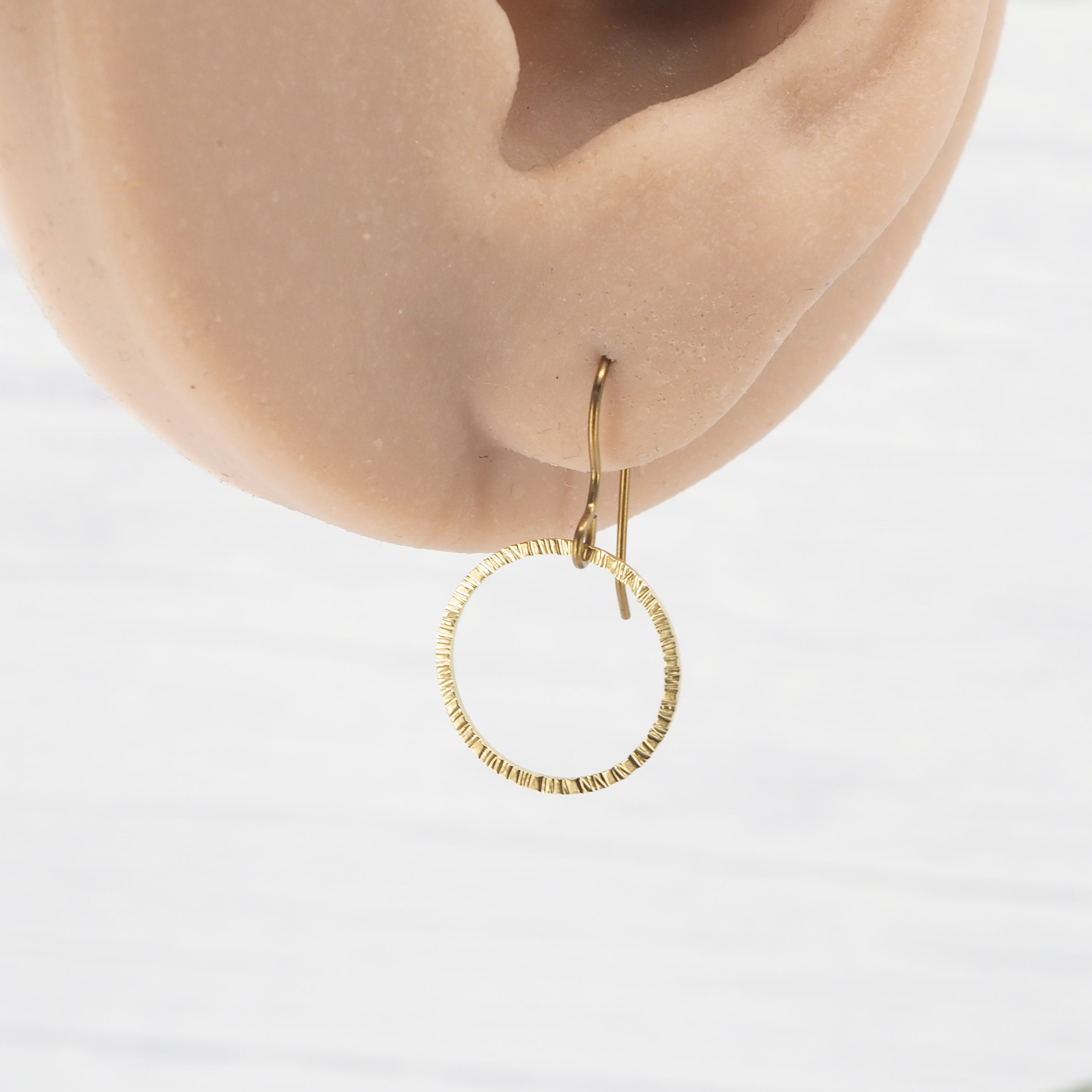 Small hand-hammered bark texture Brass ring dangle earrings. Great for all occasions.