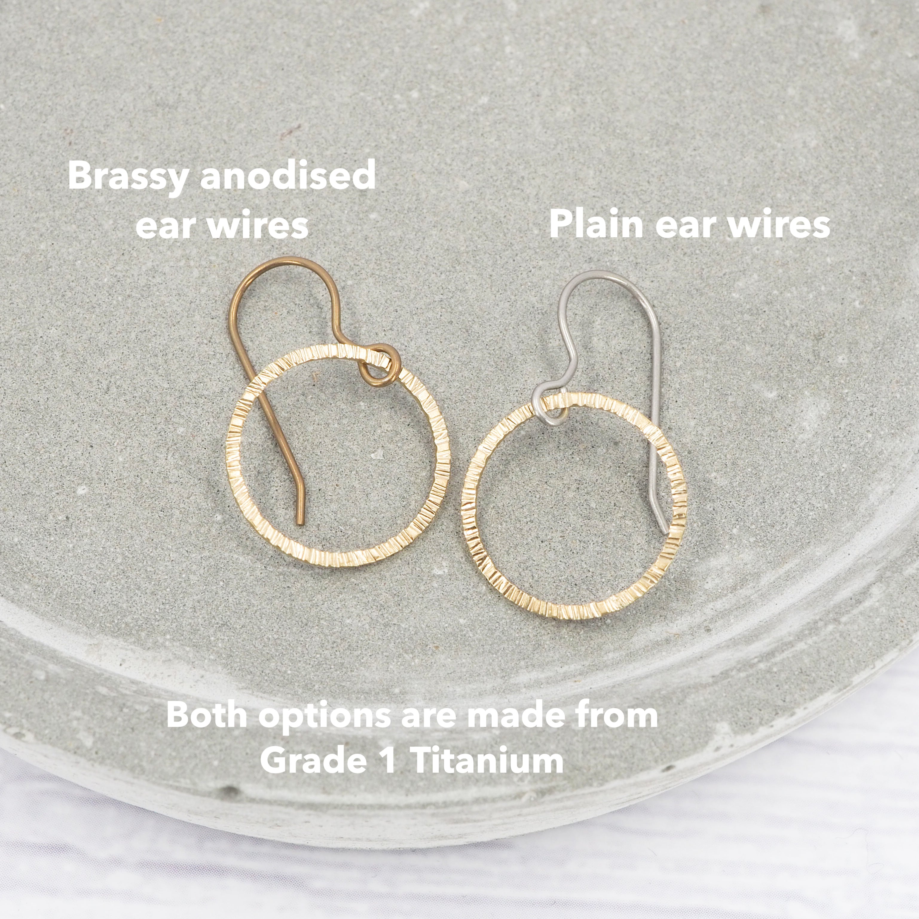 Choice of either plain titanium ear wires or anodised brassy tone titanium ear wires.