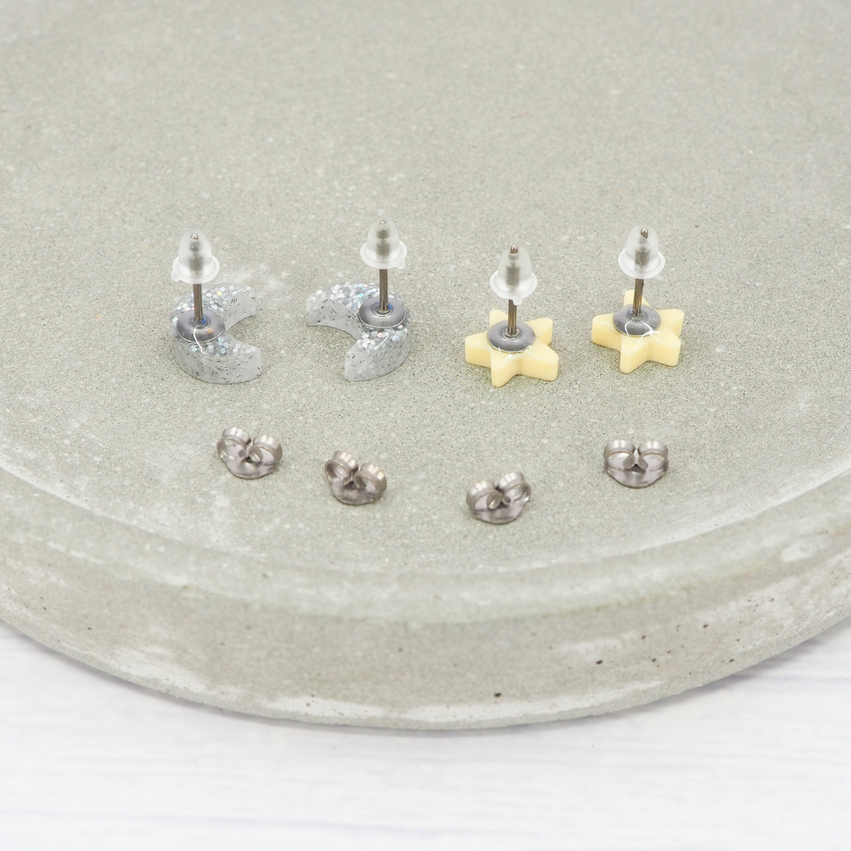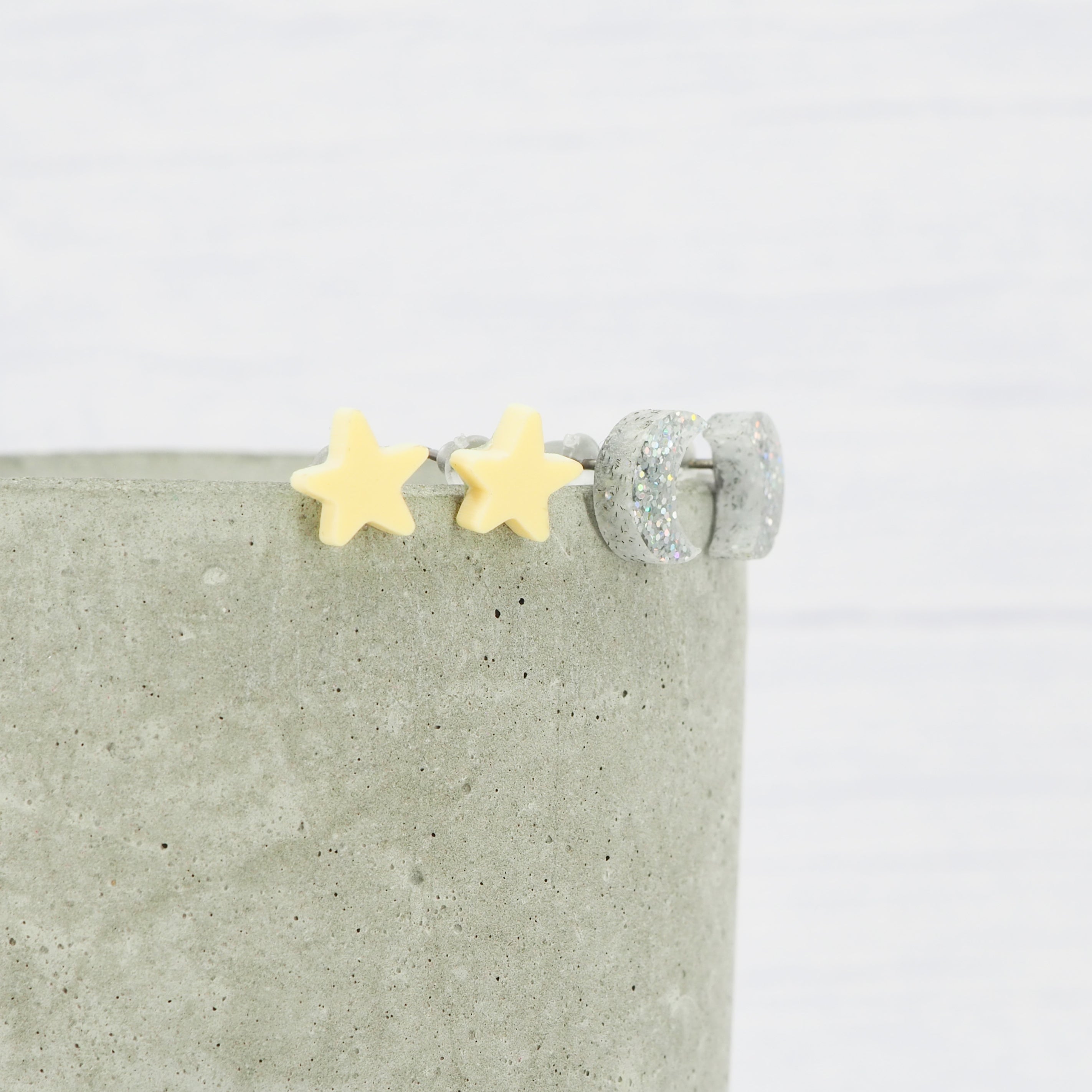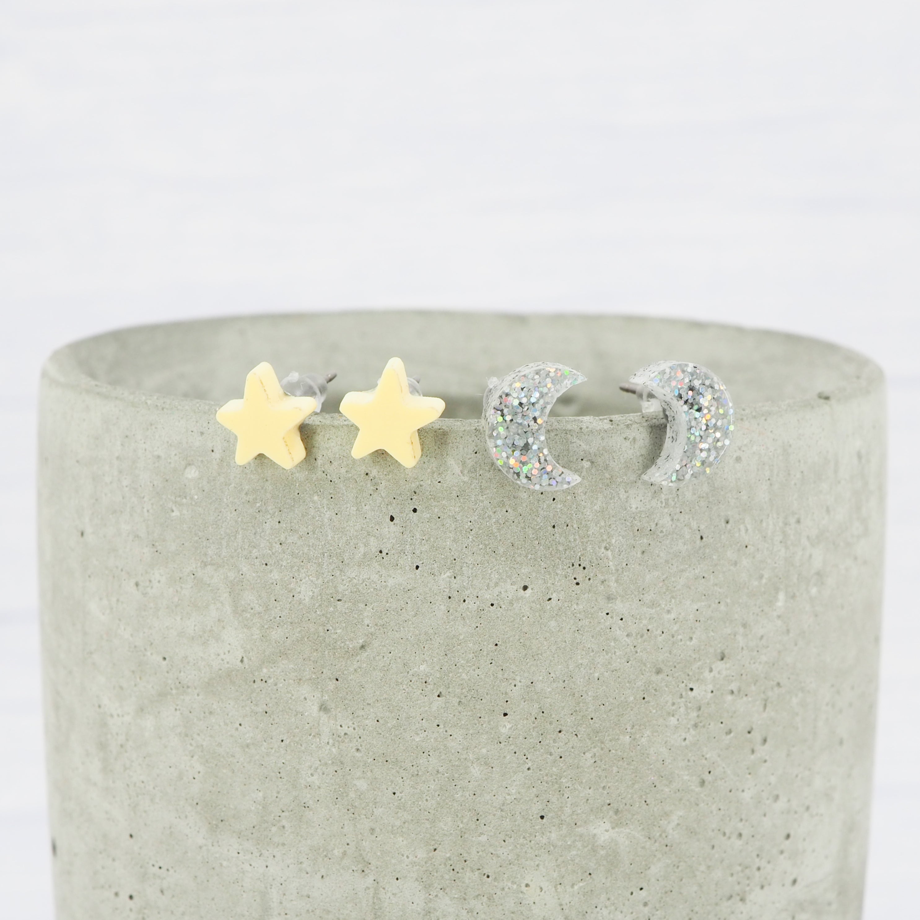 Small matte yellow Star and holographic glitter moon Stud Earrings