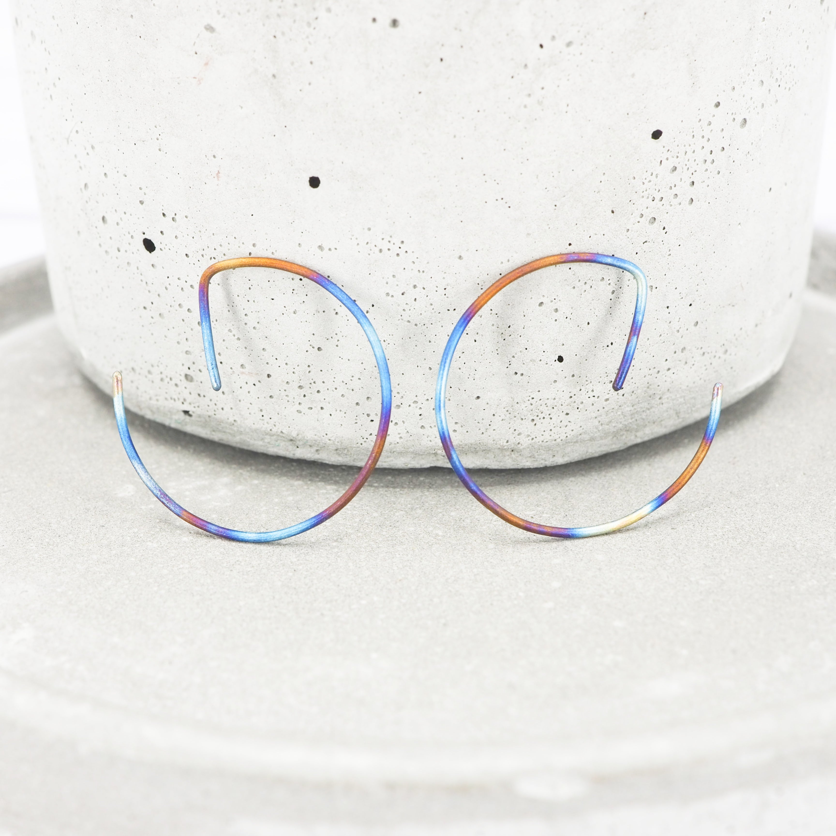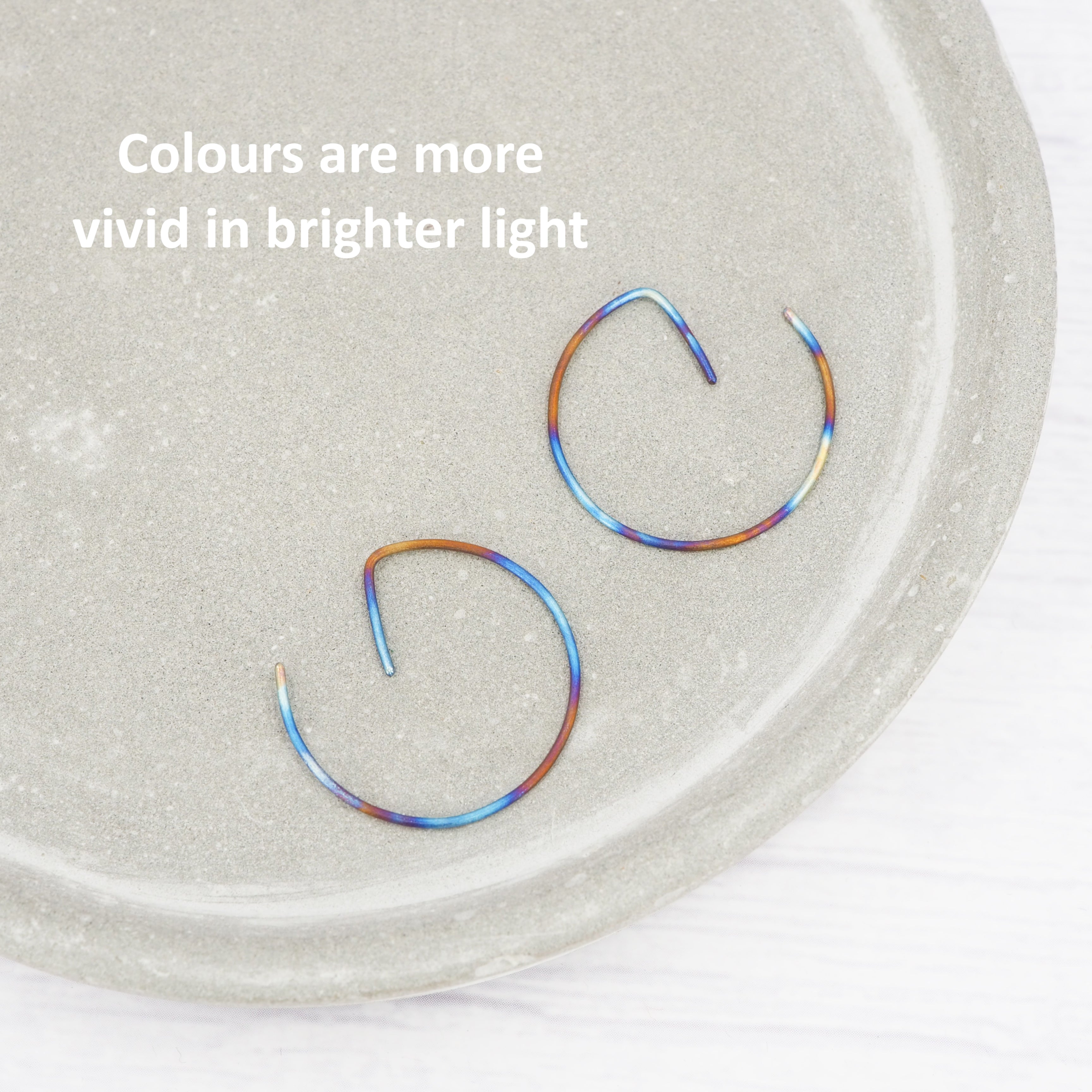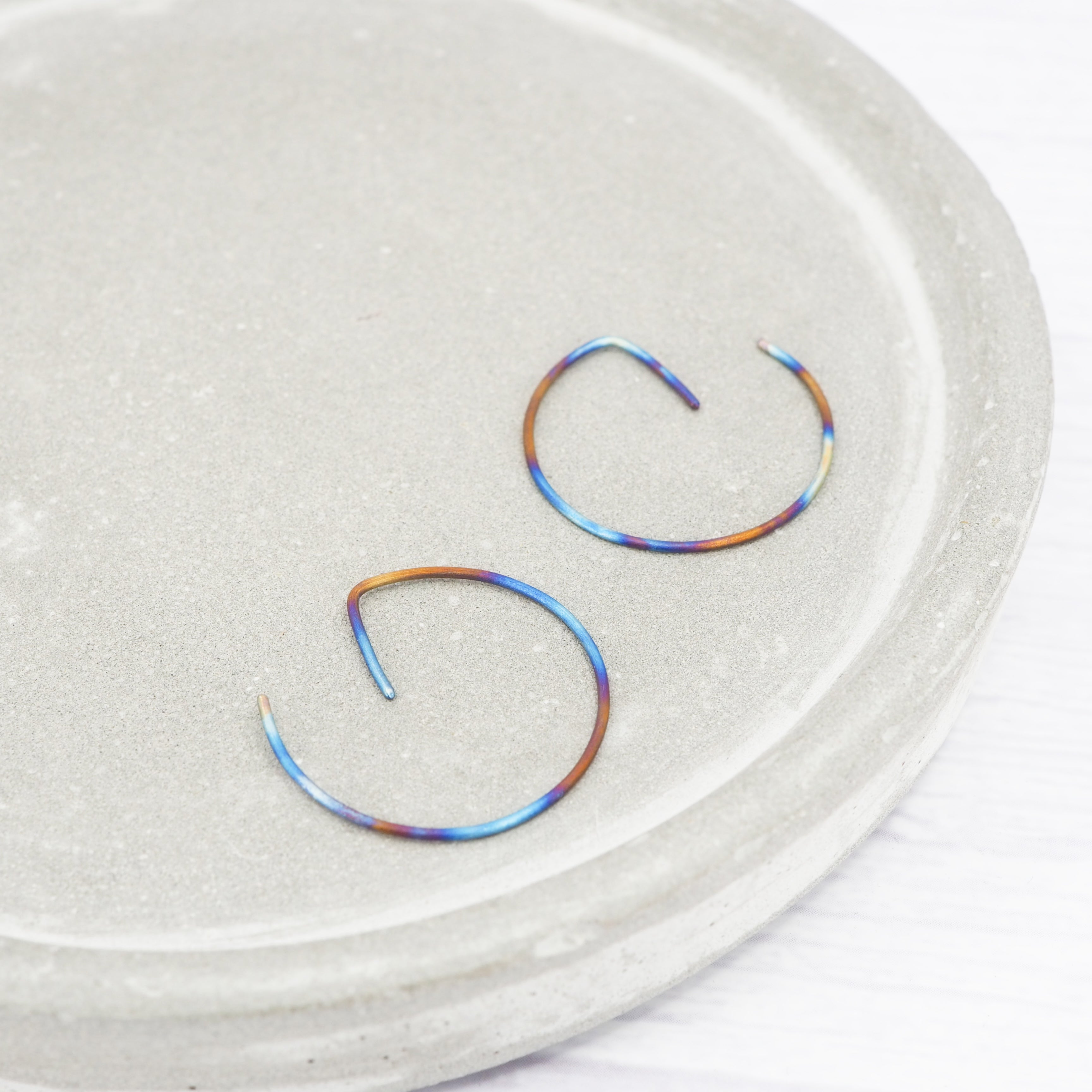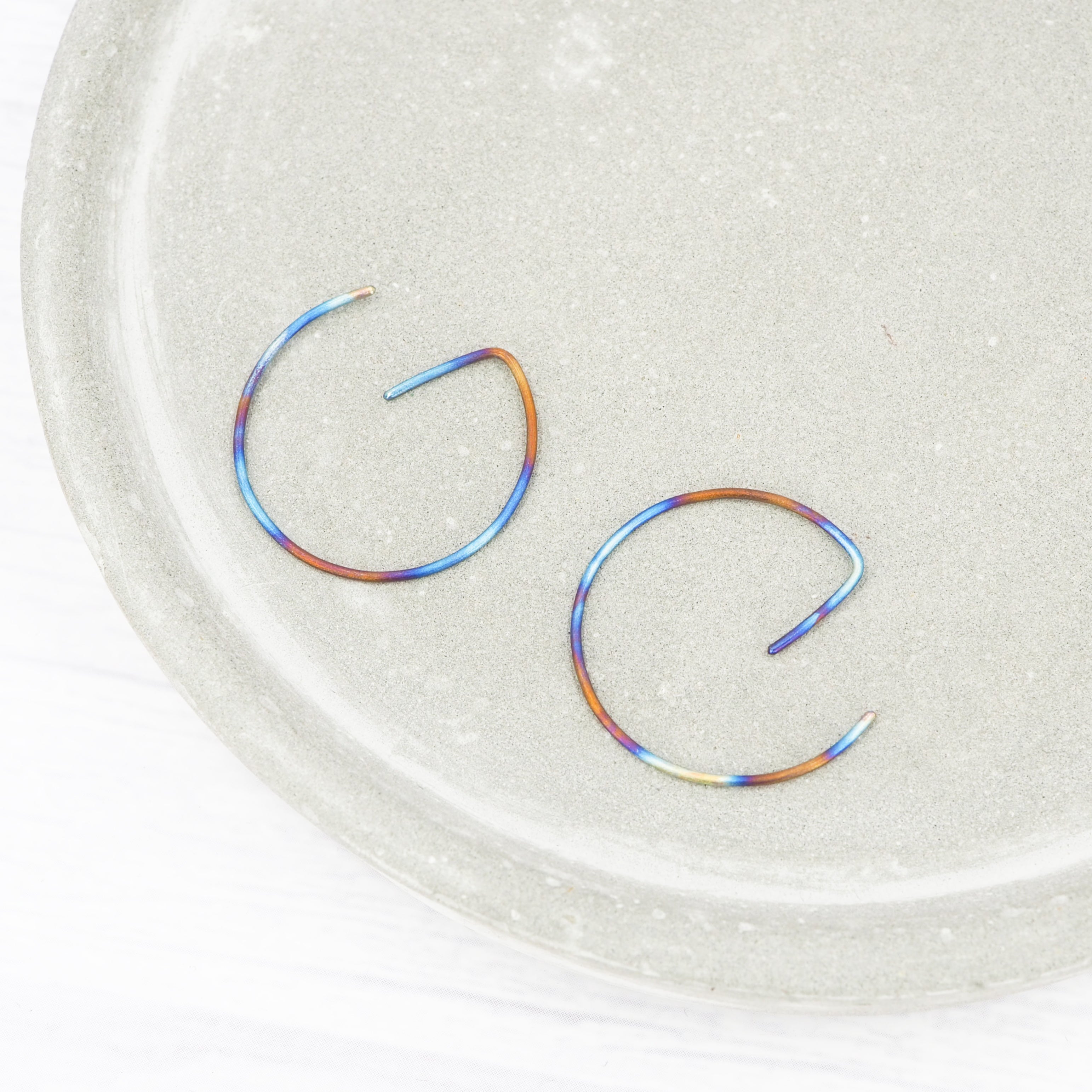 These 1" anodised titanium open hoops are designed for comfort and style. Hand formed from hypoallergenic titanium, each hoop has an approximate diameter of 1" and is lightweight, seamless and uniquely heat anodised for a one-of-a-kind look. Simple enough for everyday wear and special occasions alike. Comes wrapped in tissue paper.