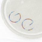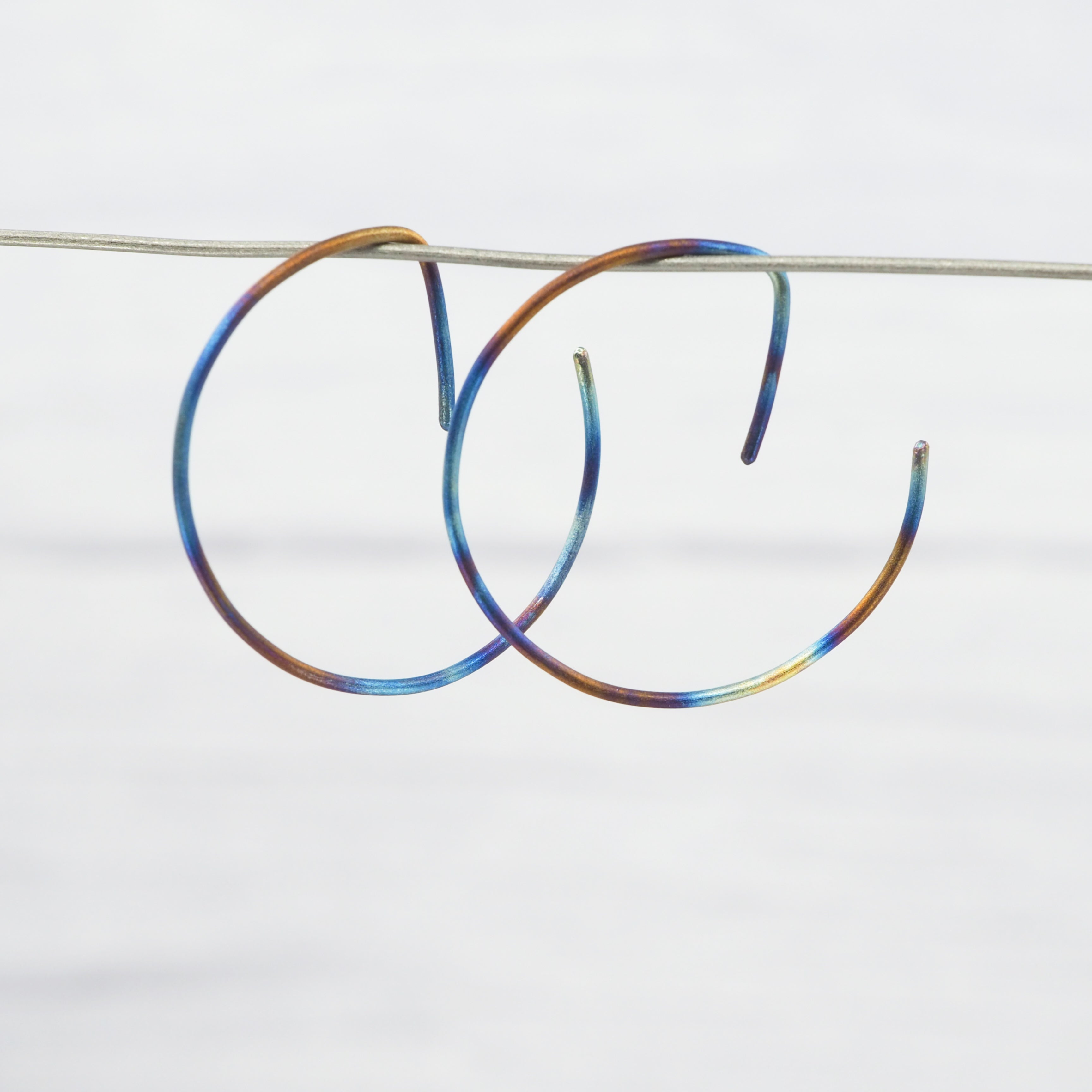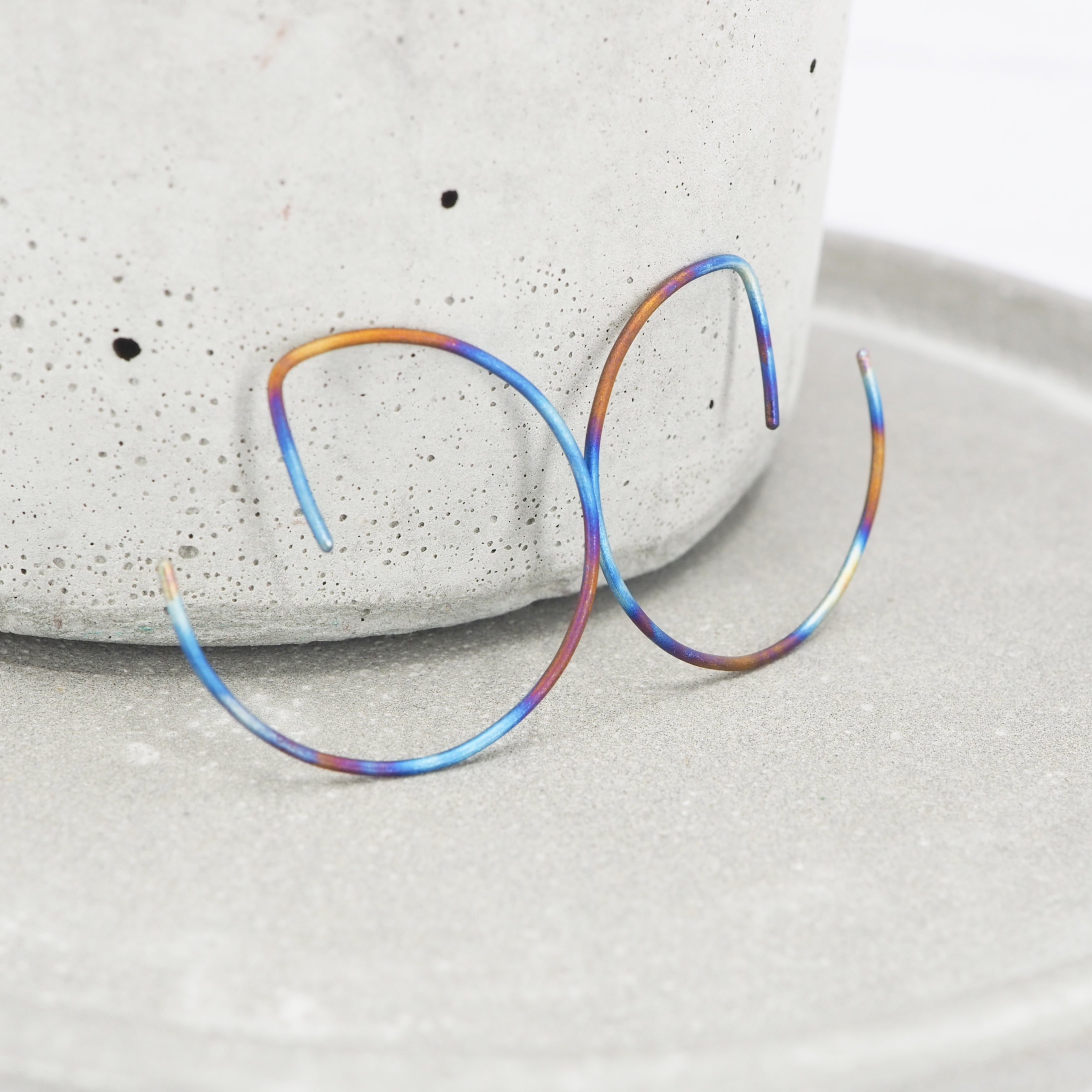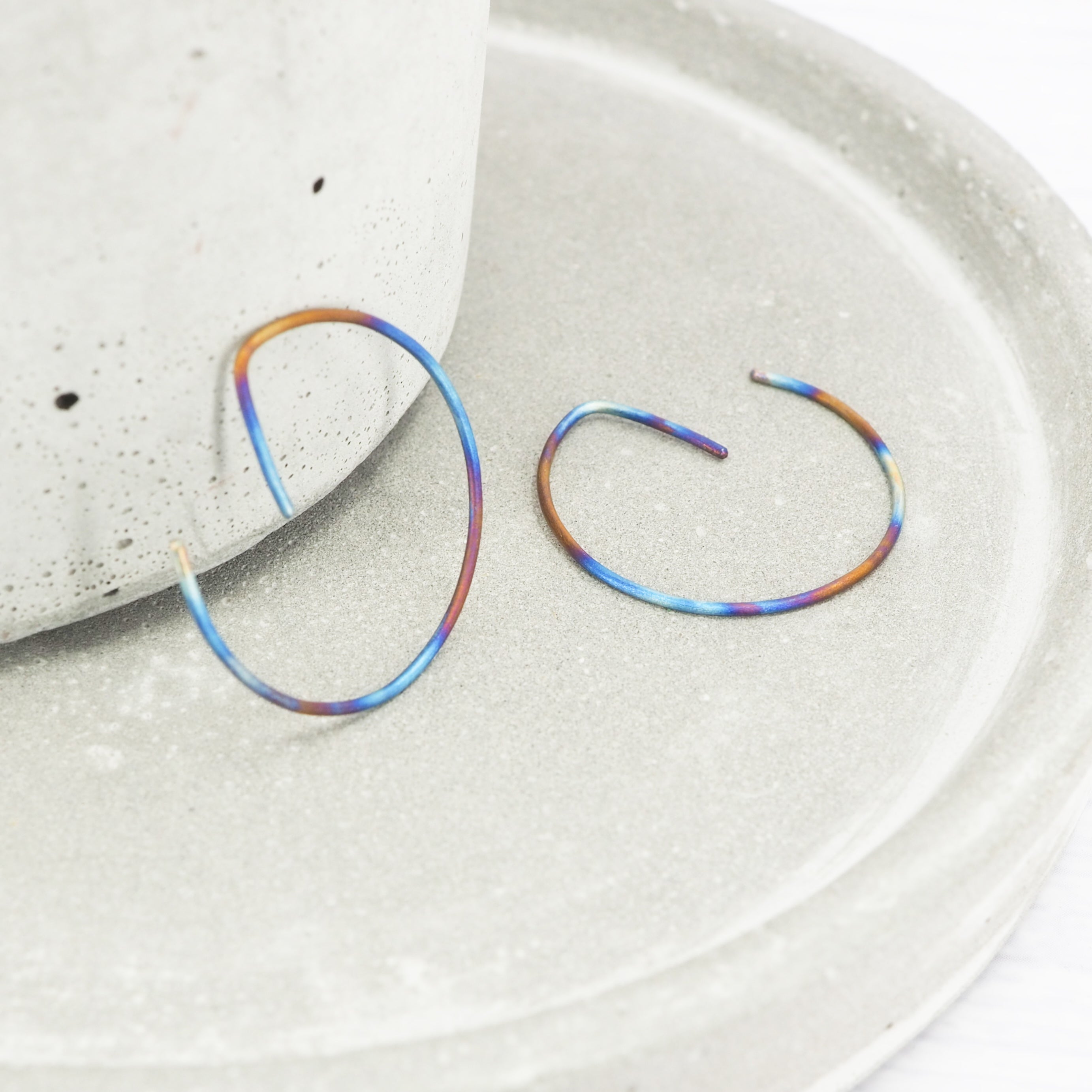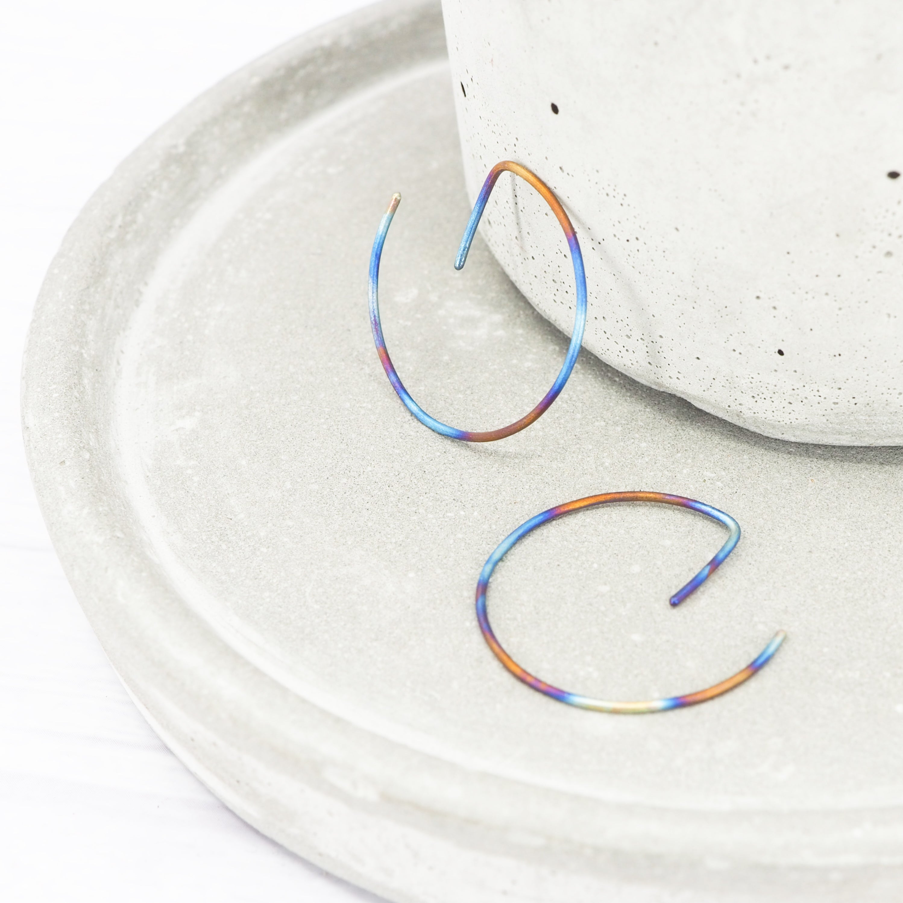 These 1" anodised titanium open hoops are designed for comfort and style. Hand formed from hypoallergenic titanium, each hoop has an approximate diameter of 1" and is lightweight, seamless and uniquely heat anodised for a one-of-a-kind look. Simple enough for everyday wear and special occasions alike. Comes wrapped in tissue paper.