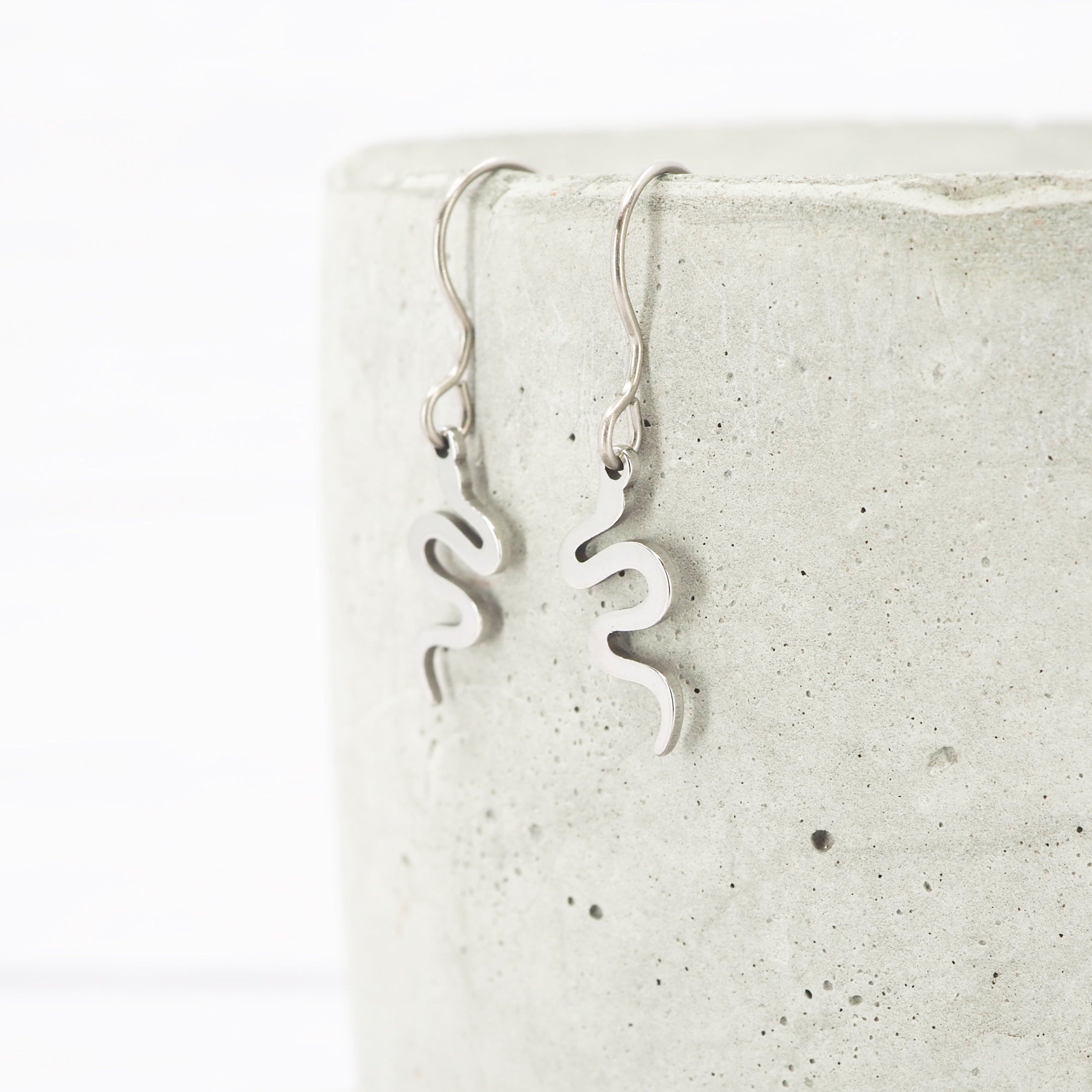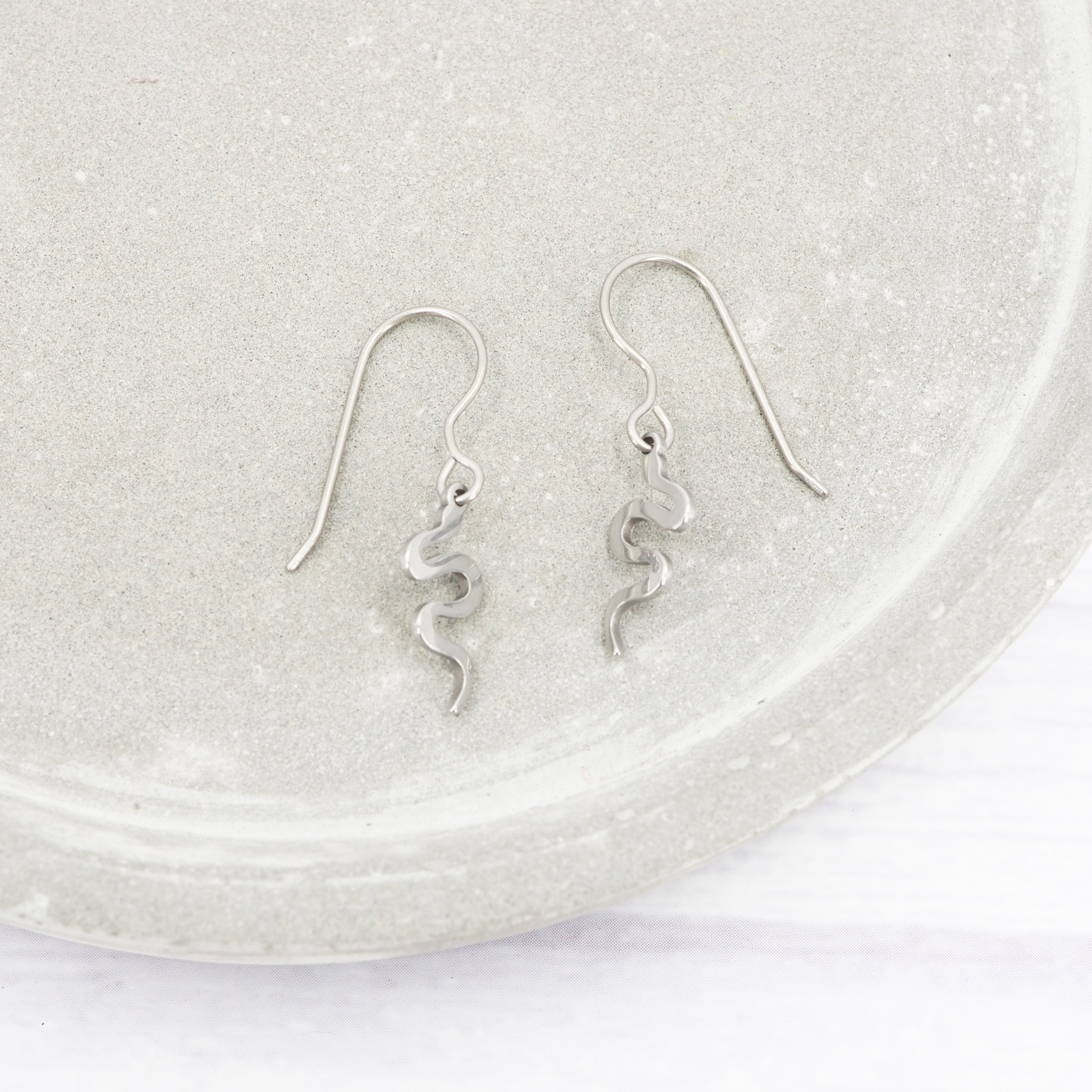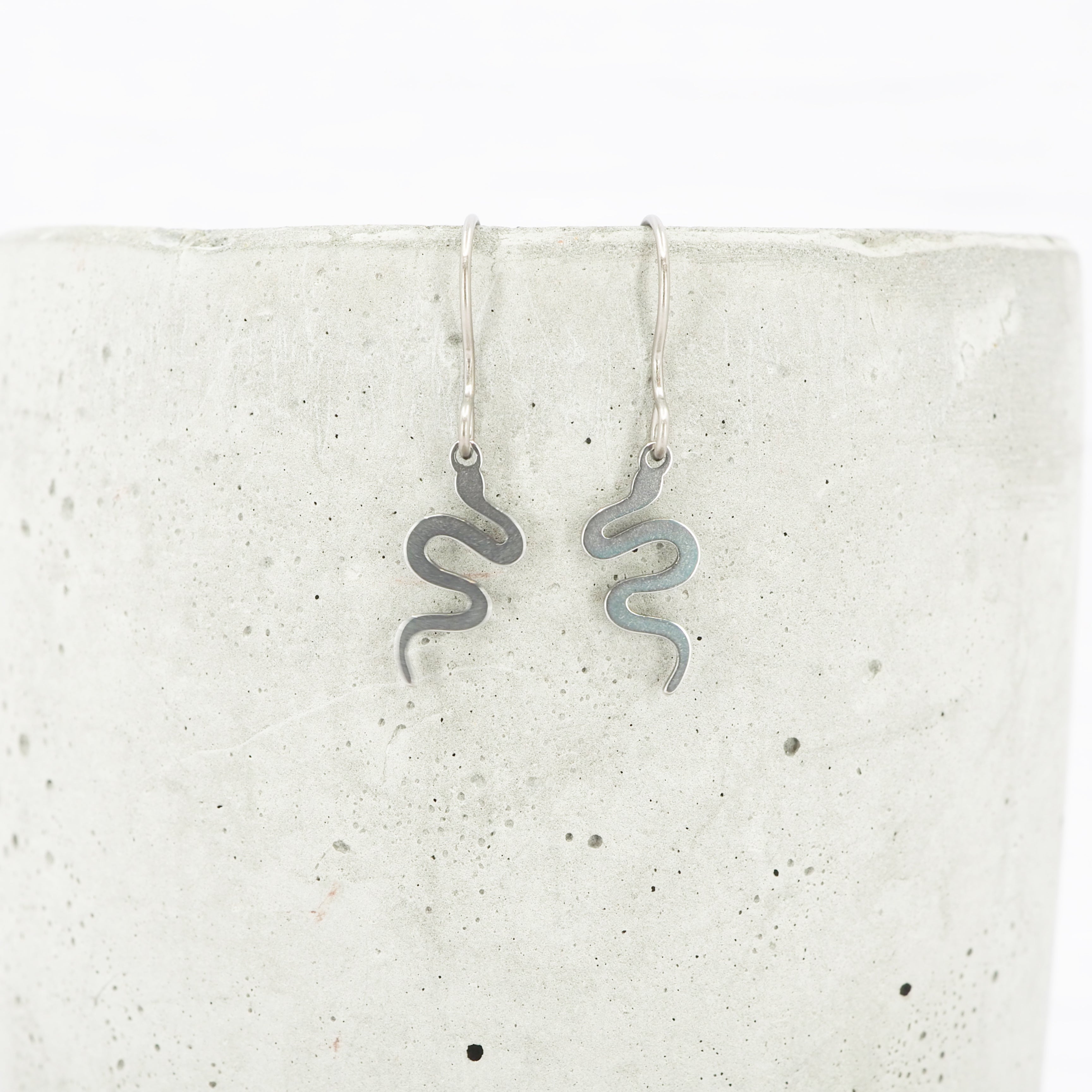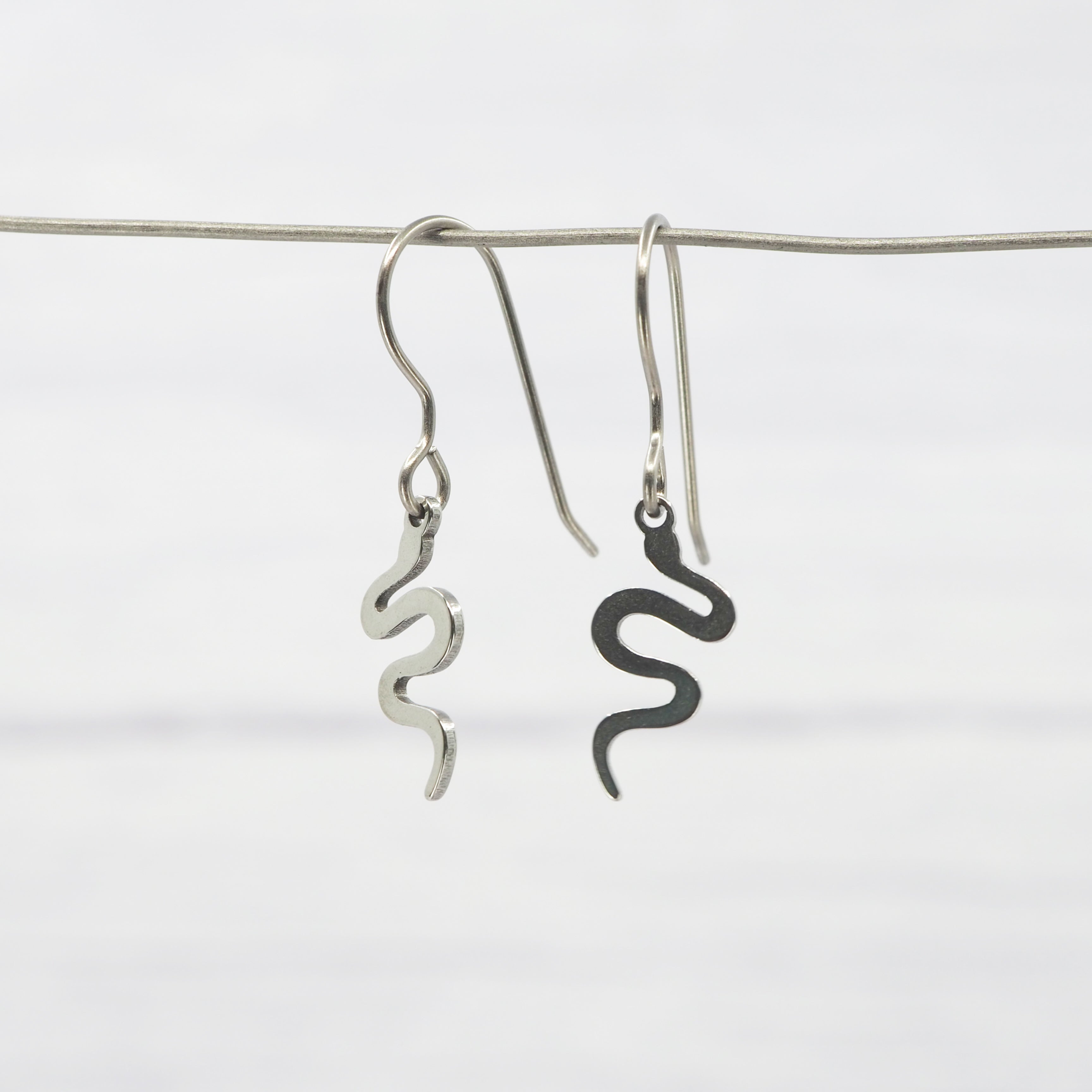 Stainless steel Snake dangle earrings with Grade 1 0.7mm titanium ear wires.