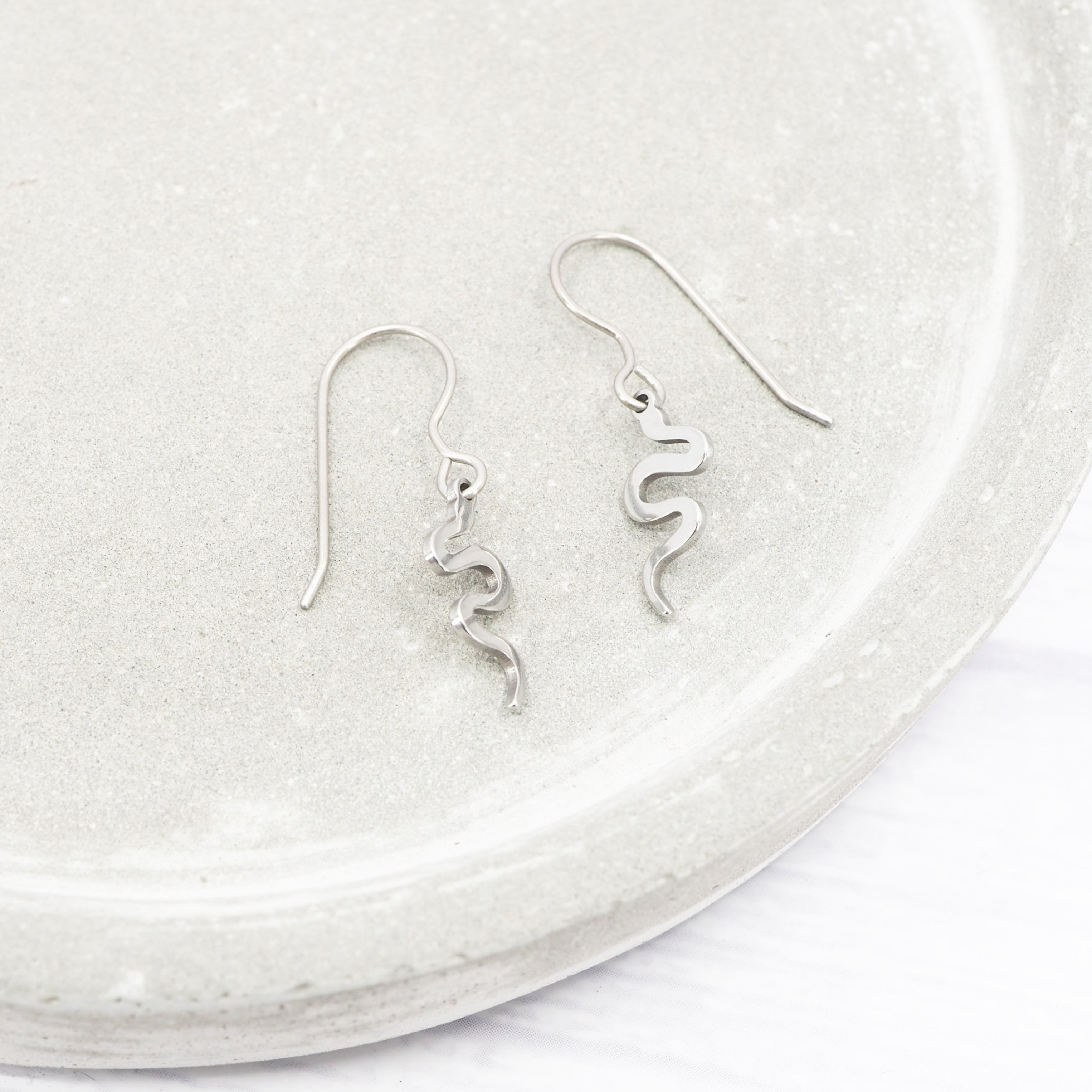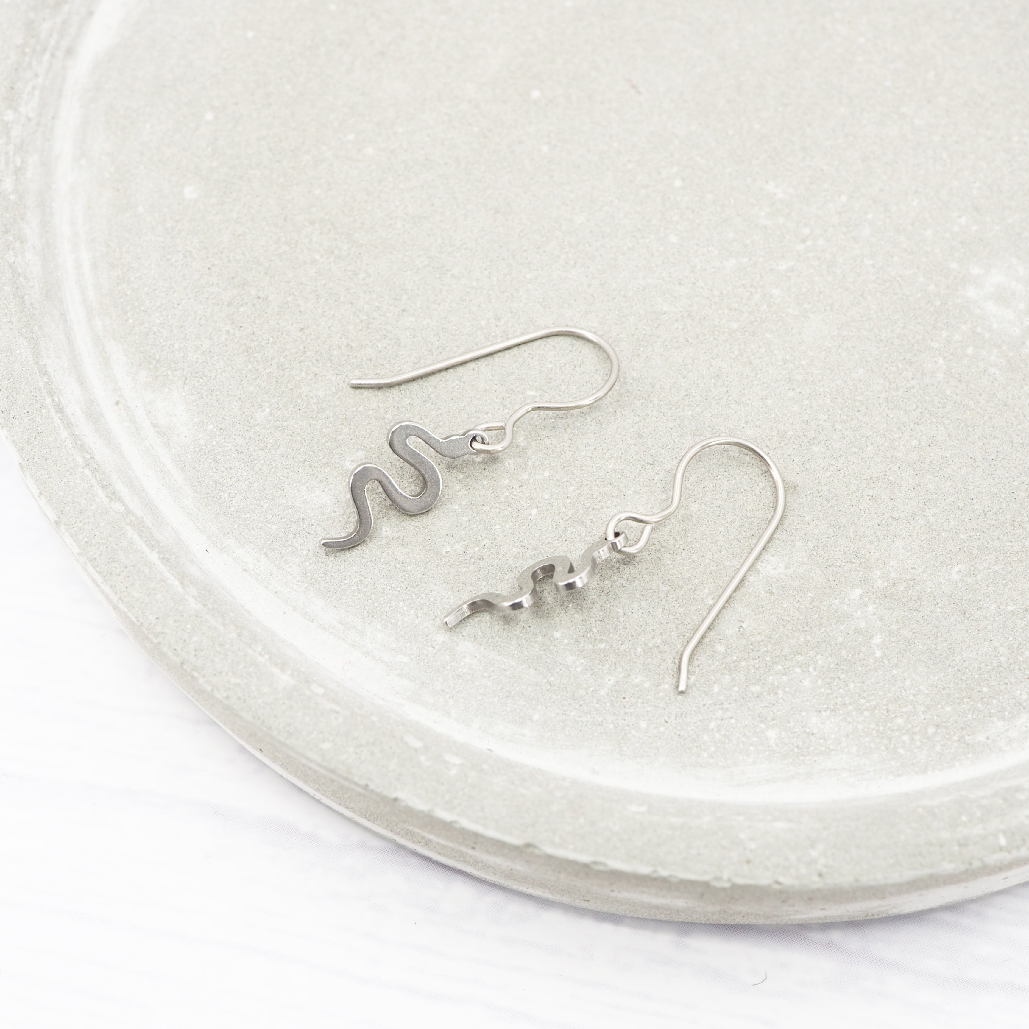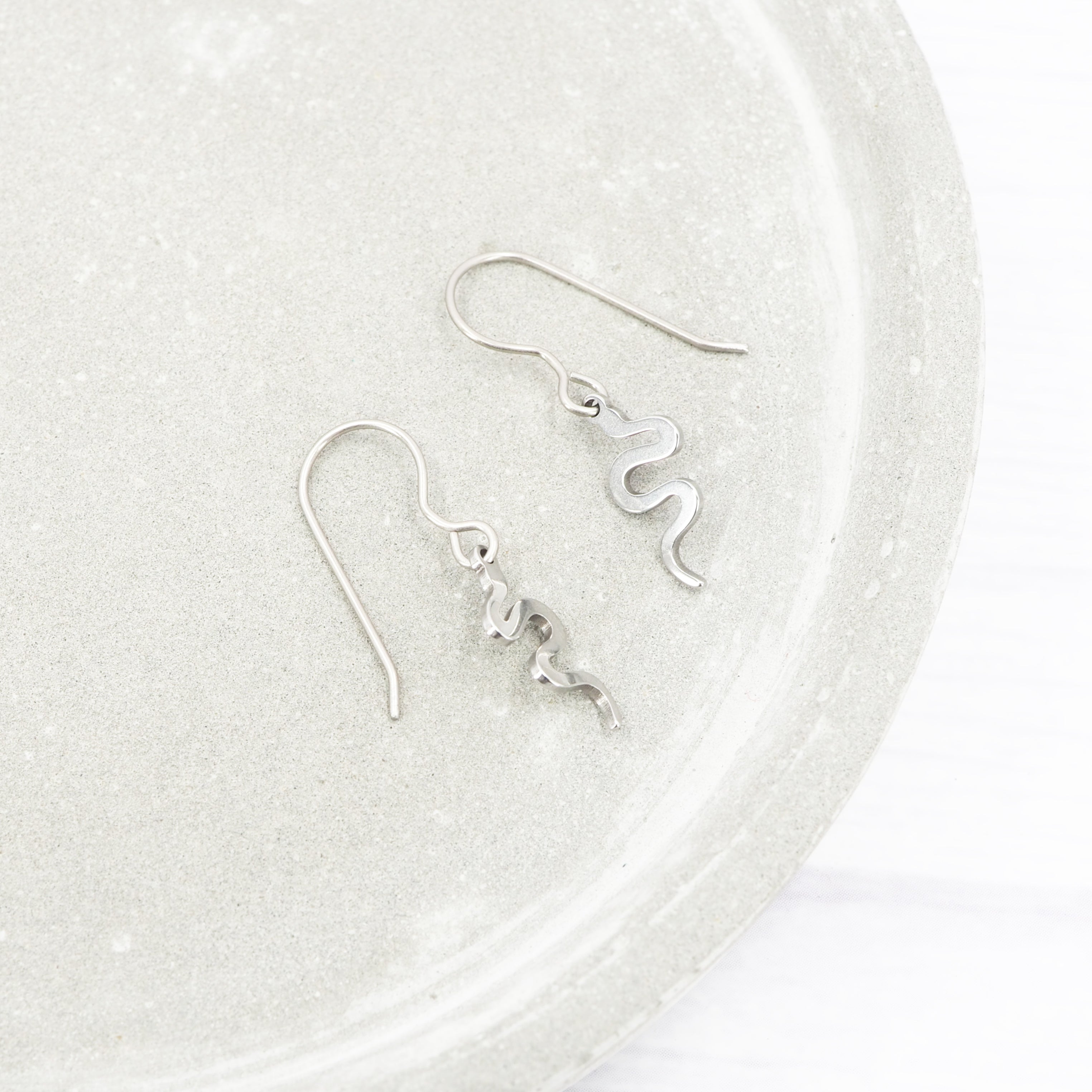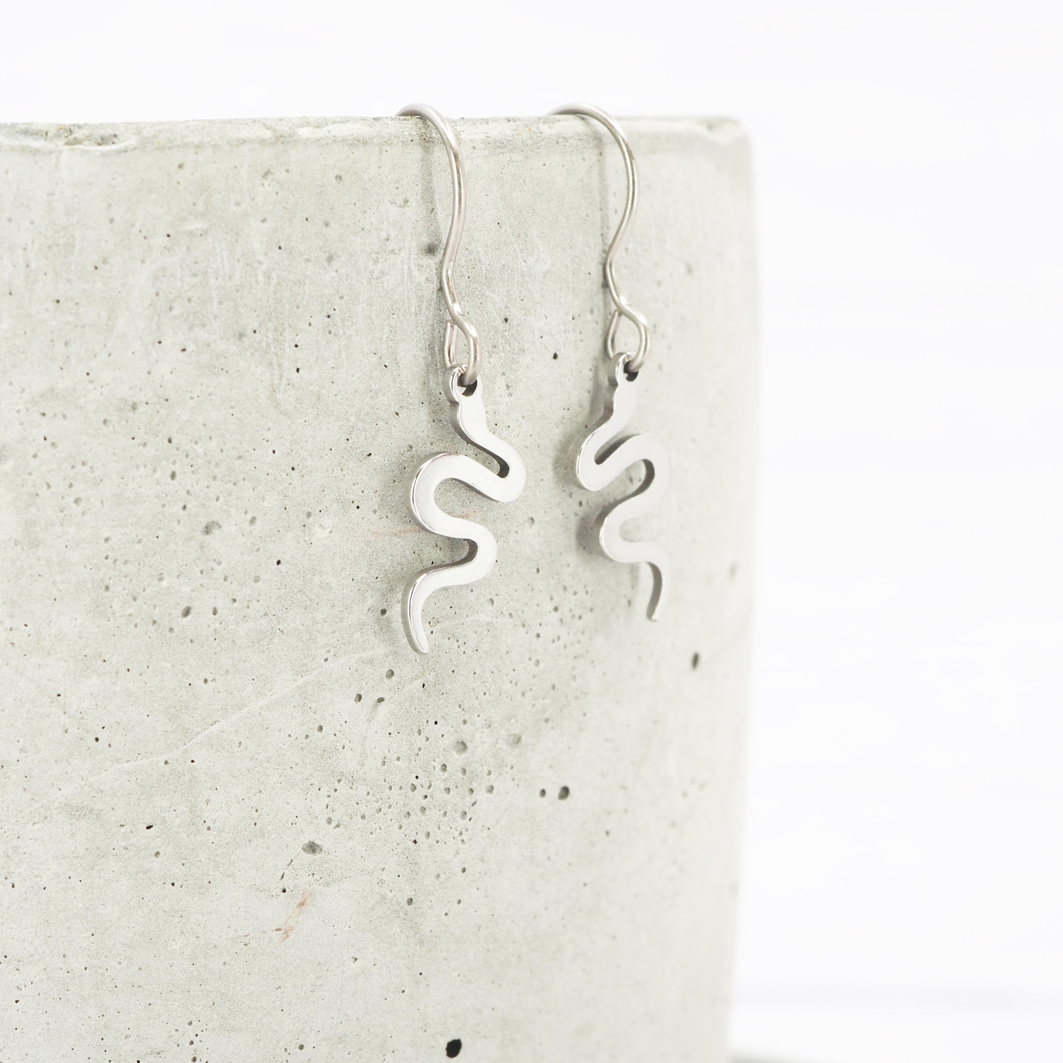 Stainless steel Snake dangle earrings with Grade 1 0.7mm titanium ear wires.