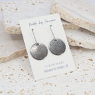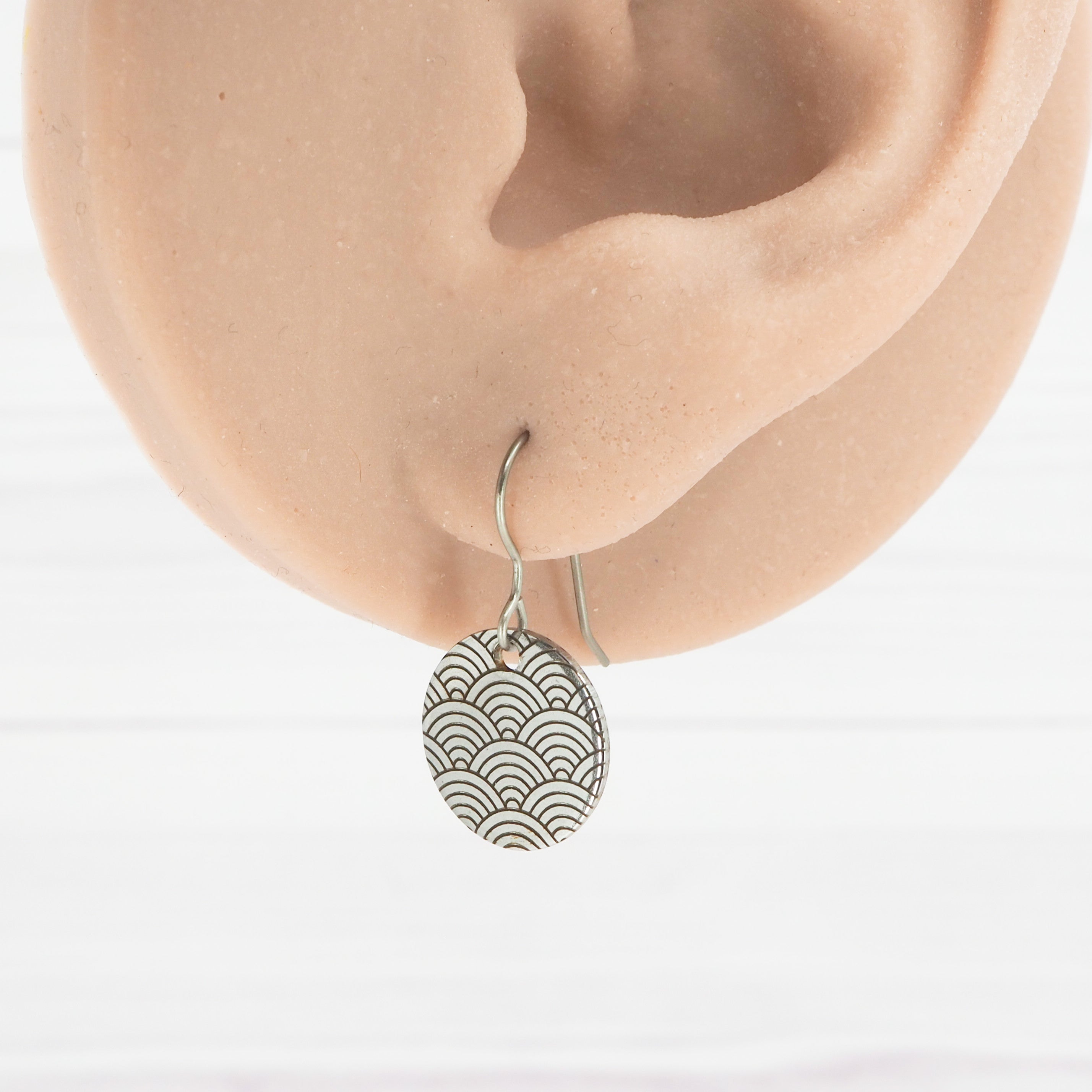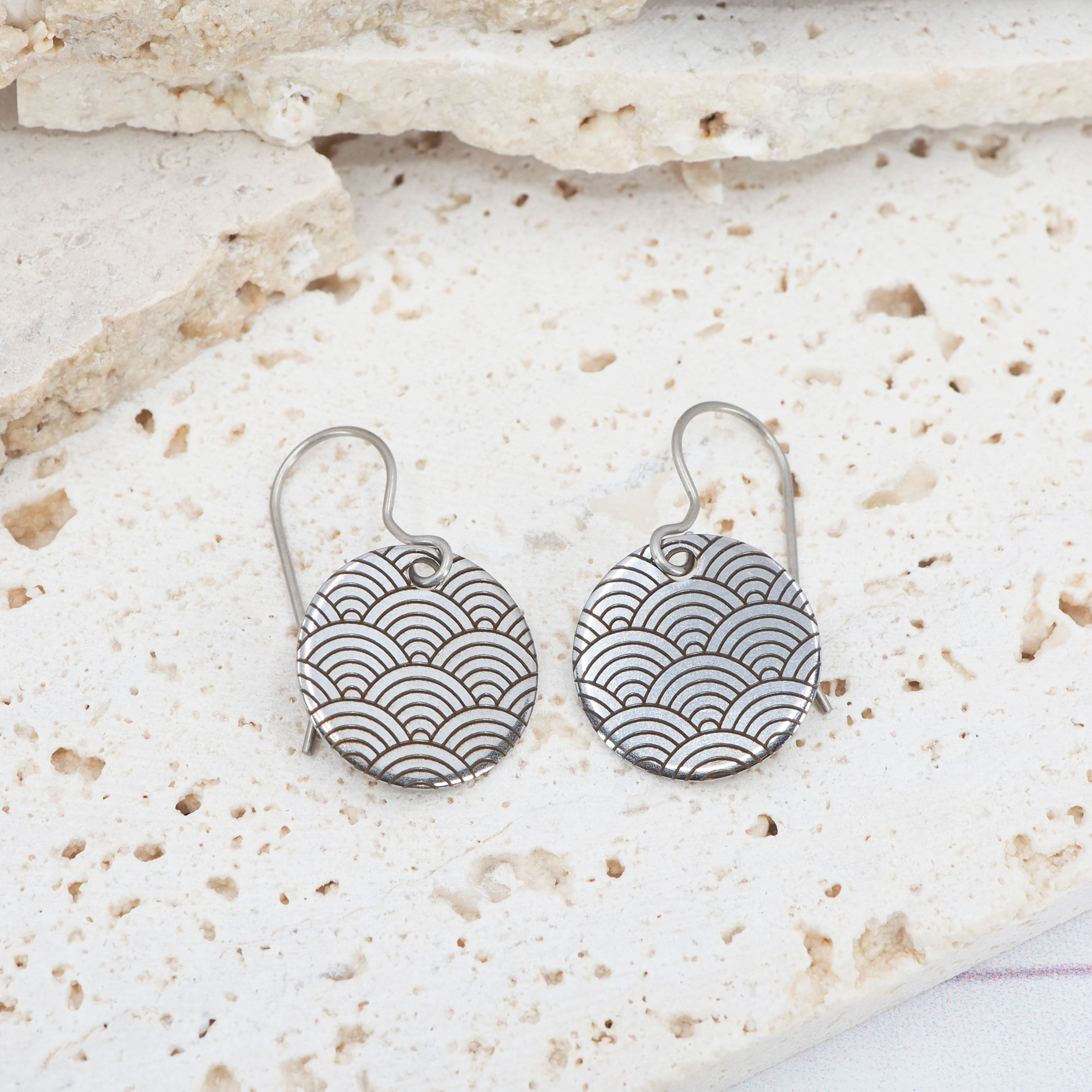 15mm round stainless steel laser etched dangle earrings.